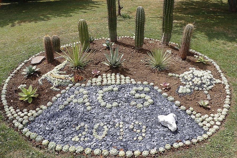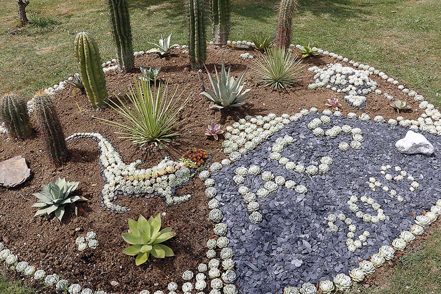 Placé sur un rond-point, c'est un véritable tableau réalisé avec un thème magnifique. L'abeille vient butiner la petite fleur, quel romantisme... Et Echeveria elegans avec ses couleurs bleutées. Bravo pour l'artiste... |