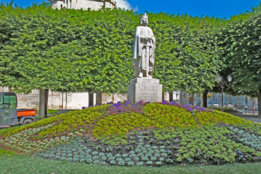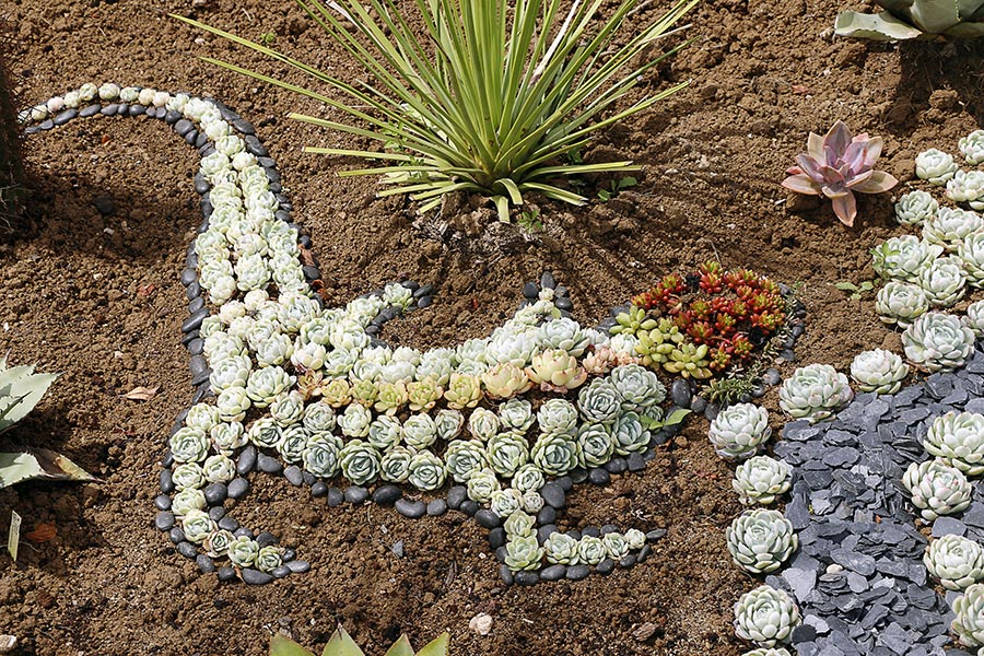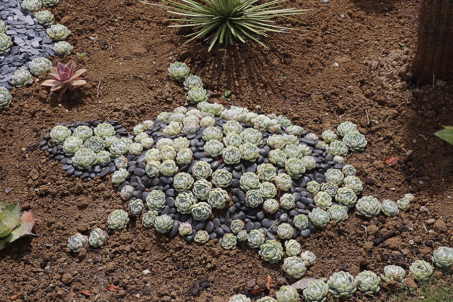 Le 18 juin 2014 à Cergy Pontoise (95), des echeverias dans le jardin public et au pied de la statue de Saint-Louis.