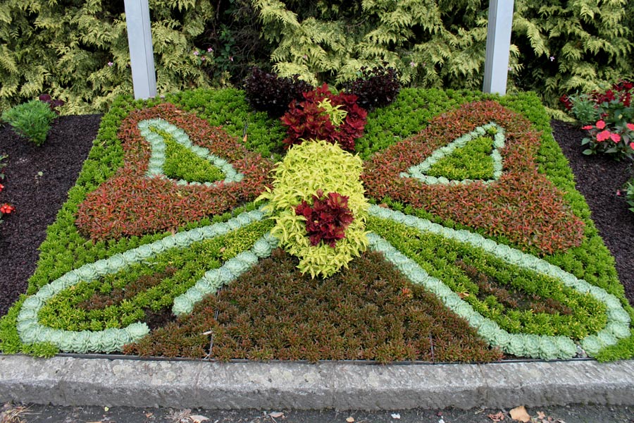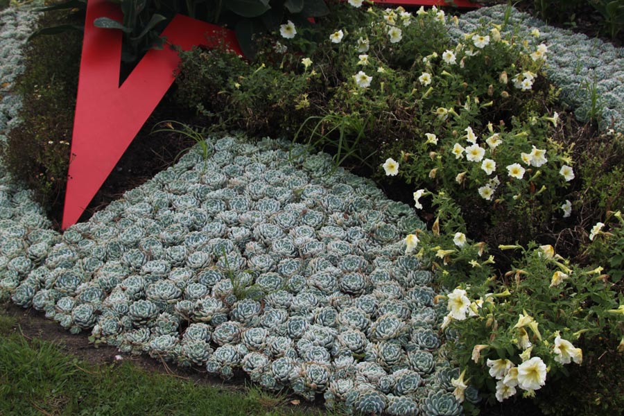 Le 9/09/2009, à Calais l'un des plus beaux ronds de France représente un magnifique paon et les végétaux qui constituent le cou de l'oiseau ont été fixés verticalement sur une armature de grillage. Bien sûr parmi les végétaux utilisés, nous retrouvons 2 espèces d'echeverias dont la variété elegans.