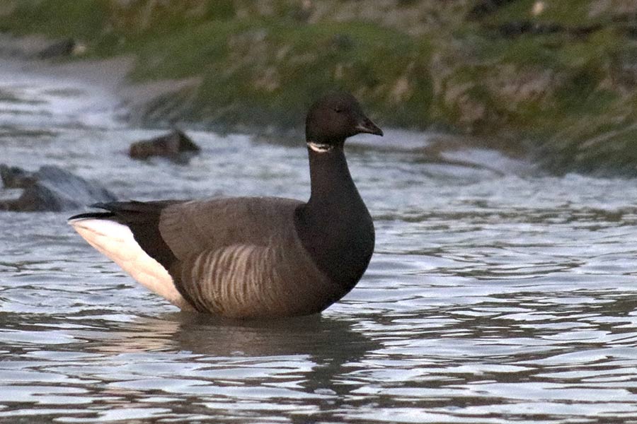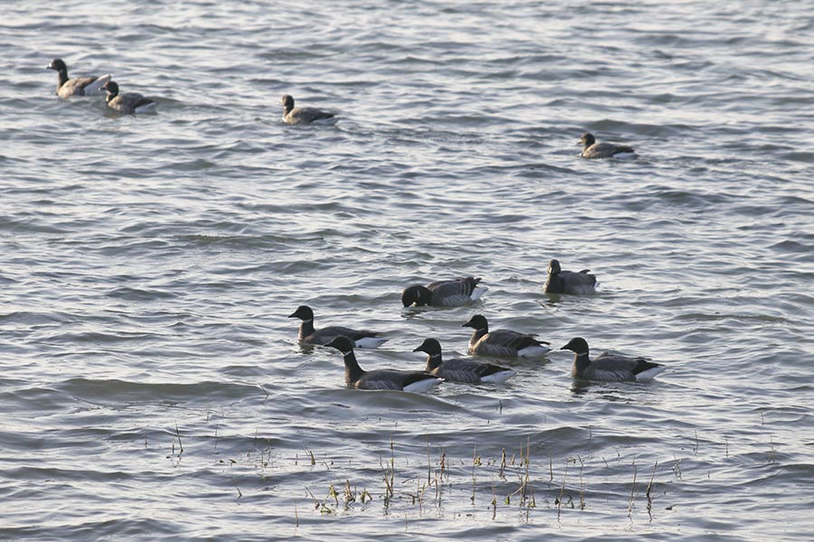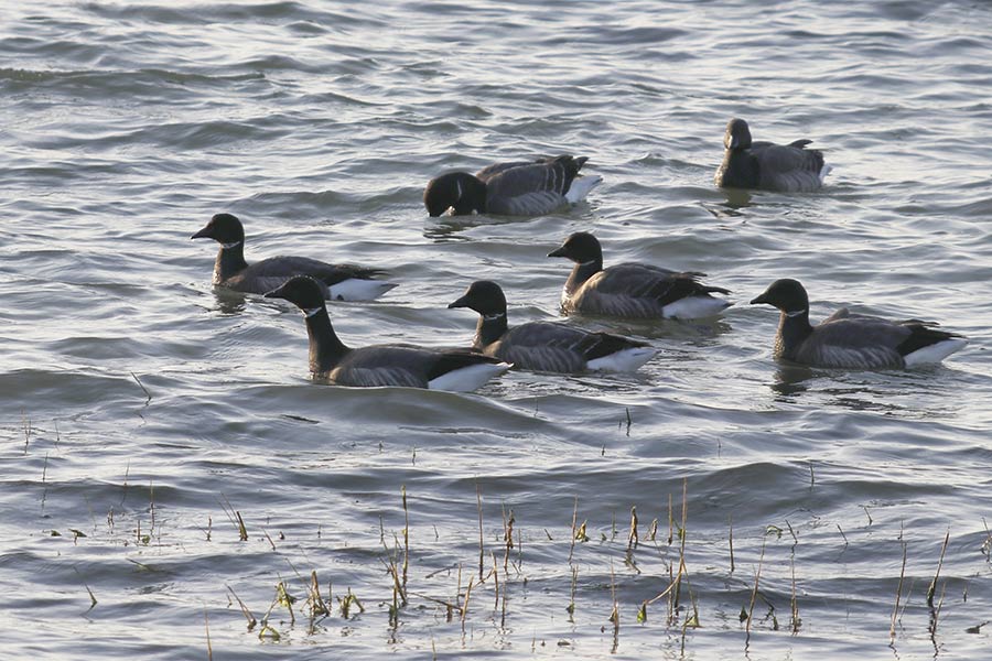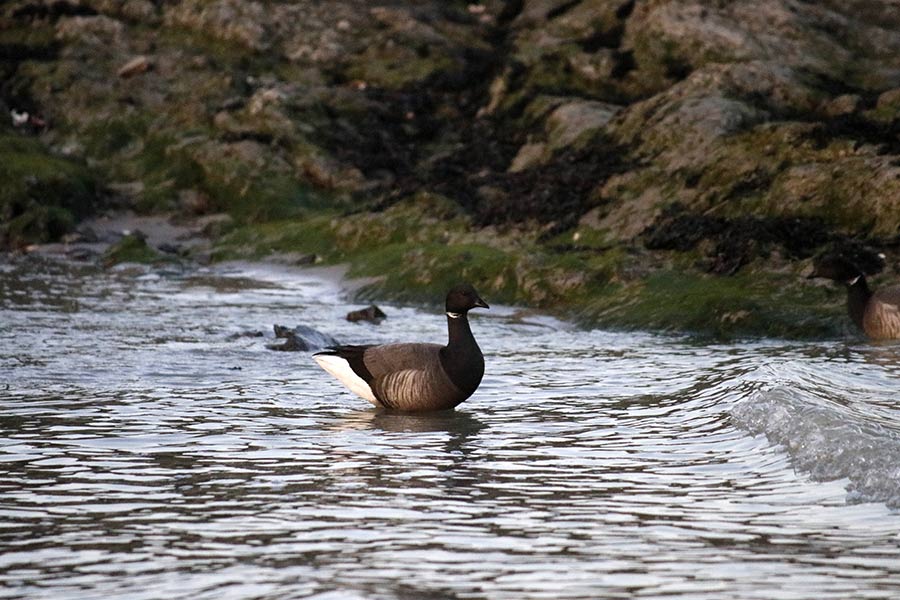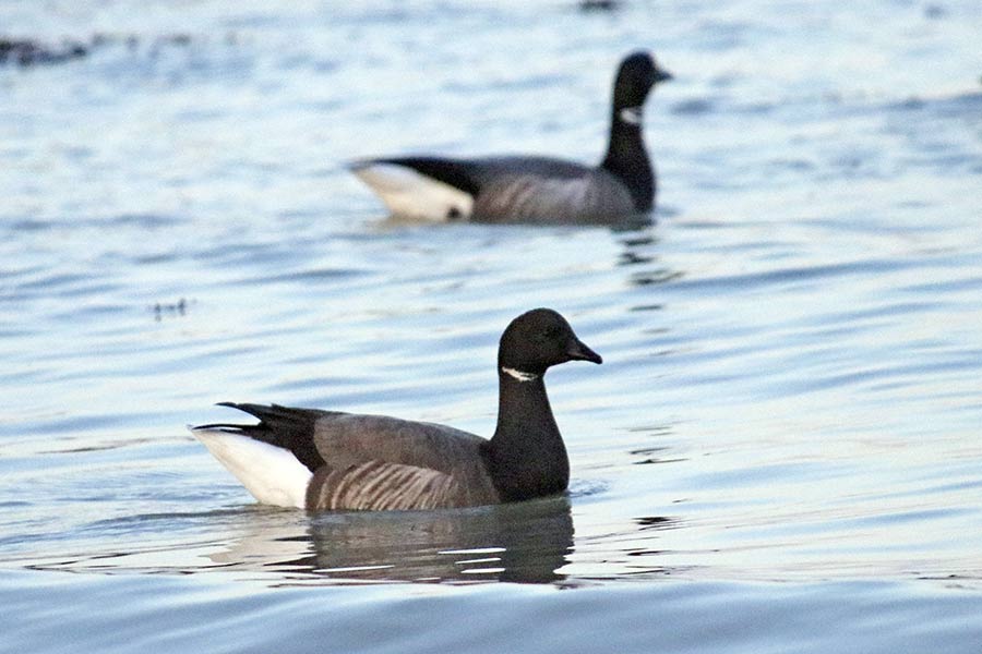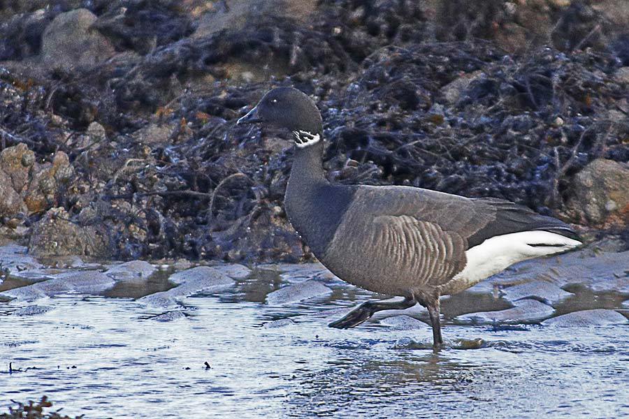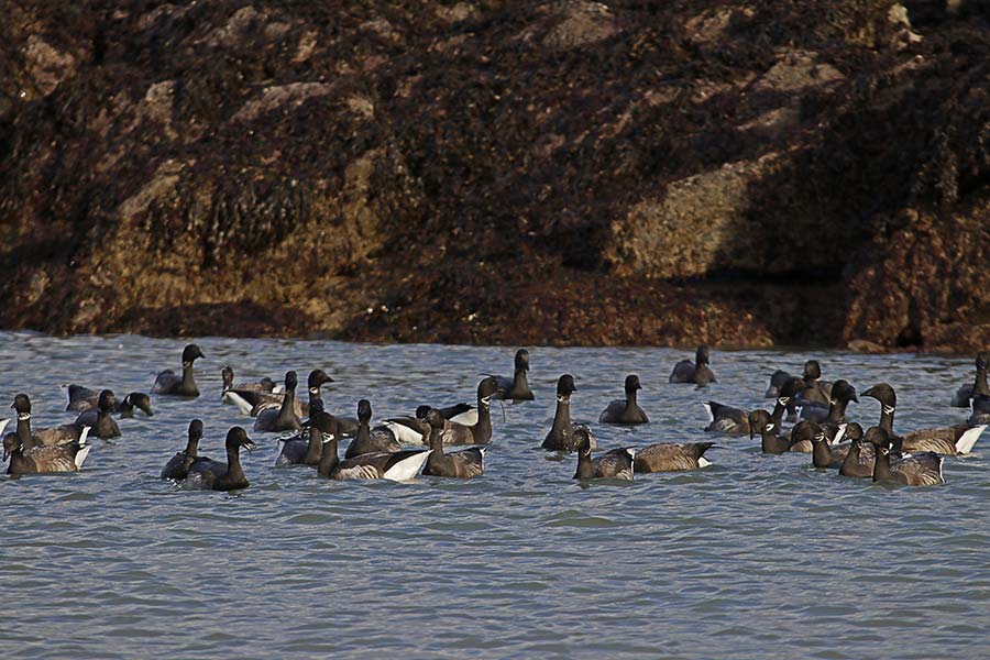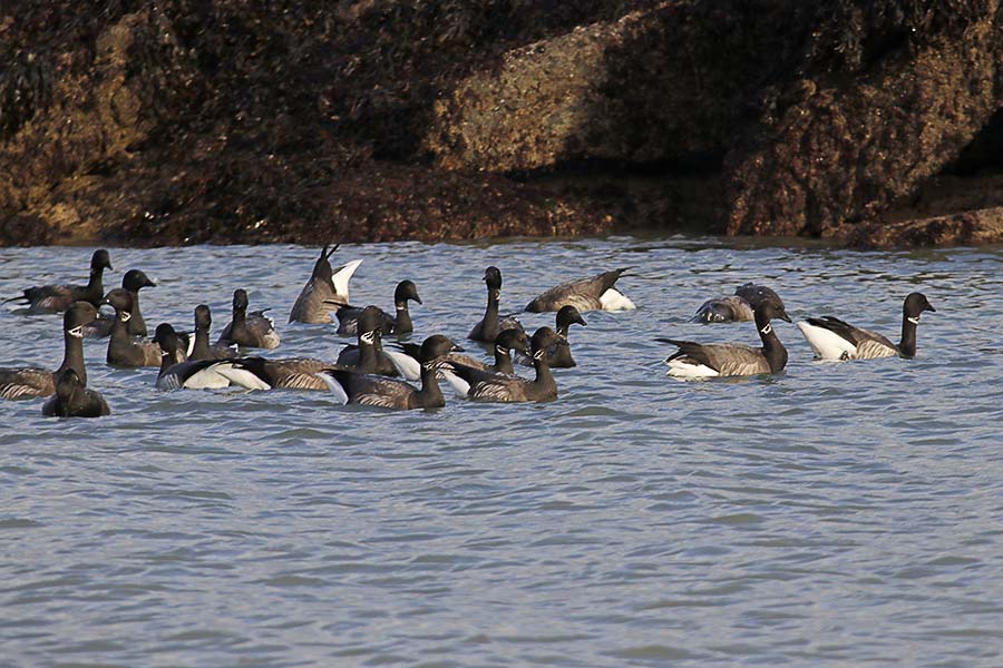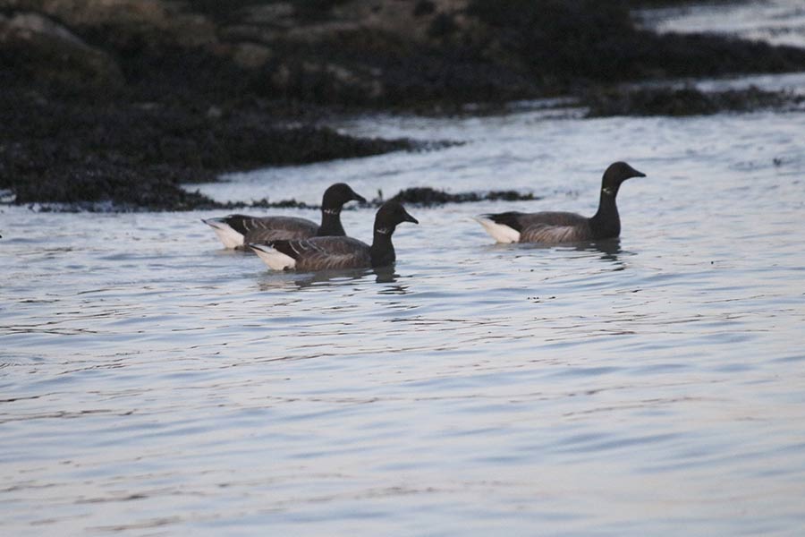 Si le dos est de couleur uniforme chez l'adulte (bernache de tête), on remarque plusieurs liserets blancs sur le haut du dos pour les 2 bernaches suiveuses qui sont des jeunes de moins d'un an.