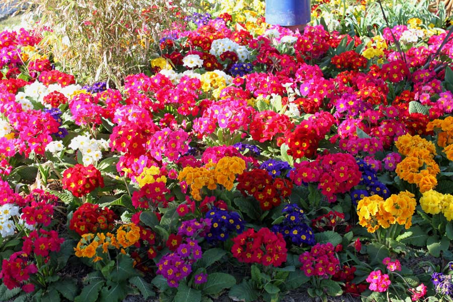 une photo de primevères hybrides dans une rue de Jullouville très colorée le 6 avril 2012