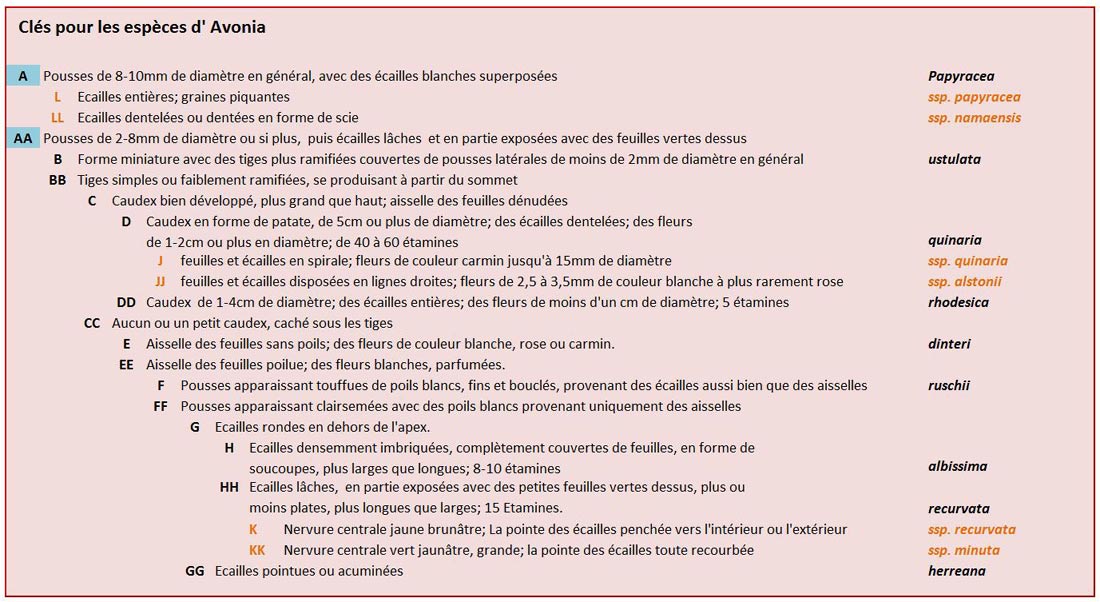 Les plantes n'ont pas de feuilles vertes comme Anacampseros et sont couvertes d'écailles. La forme de ces écailles contribura à identifier les espèces. Anacampseros comptonii a des feuilles vertes et un joli petit caudex et Avonia quinaria a également un caudex mais des écailles blanches et aucune feuille verte.