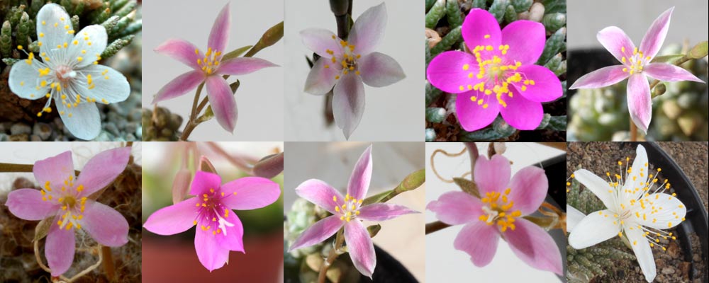 Voici quelques fleurs d'Anacampseros et d'Avonia. Les pétales ont soit une forme arrondie soit une forme pointue avec les formes intermédiaires. Le nombre d'étamines est variable d'une espèce à une autre.
