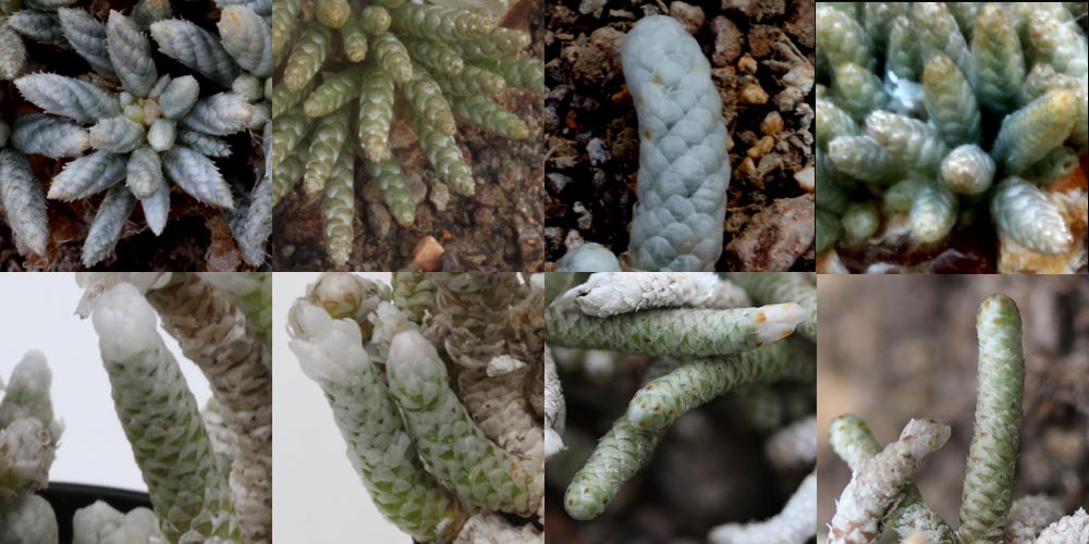 Dans ma collection, Avonia quinaria ssp. alstonii possède bien des tiges recouvertes d'écailles disposées en ligne droite. En revanche, j'ai bien deux Avonia quinaria ssp. quinaria qui présentent des écailles disposées en spirale mais j'ai deux autres plantes qui possèdes des écailles disposées en ligne droite (in straight rows) qui malgré tout produisent des fleurs de couleur carmin bien caractéristique de la sous espèce ssp. quinaria.