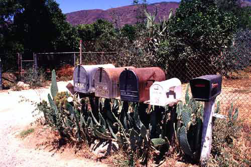 Et j'aime beaucoup ces boites aux lettres US alignées et leur décoration originale faite de cactus. |