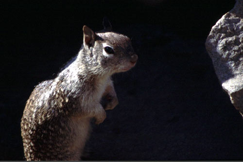 | Et bien sûr, l'écureil se méfie mais se permet d'approcher le touriste en toute sérénité. |