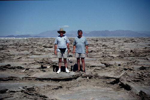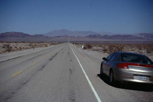 Le dimanche 10 Août 2003Nous partons de Palm Springs et nous prenons la direction de Needles. Après le passage des montagnes, nous plongeons vers Amboy. Nous traversons le "Bristol Dry Lake", lac salé complètement à sec. |
