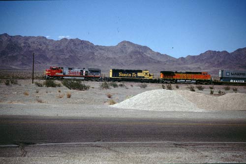 Avec quelques photos et quelques morceaux de sel, nous continuons notre route et nous croisons le train de Santa Fé, avec son kiaxon inoubliable. Nous rejoignons notre hôtel, un "motel 8" à Needles et nous y trouvons un excellent accueil et le breakfast est compris dans le prix de la chambre. Apès un passage à la piscine (il fait très chaud ici...), nous irons manger dans une pizzeria. |