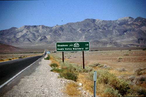 Nous étions la veille à Las Vegas et par la route 160 nous partons vers Pahrump et c'est par Shoshone que nous arrivons à la vallée de la Mort. A 30 km de Shoshone nous distinguons déjà un paysage bien montagneux.