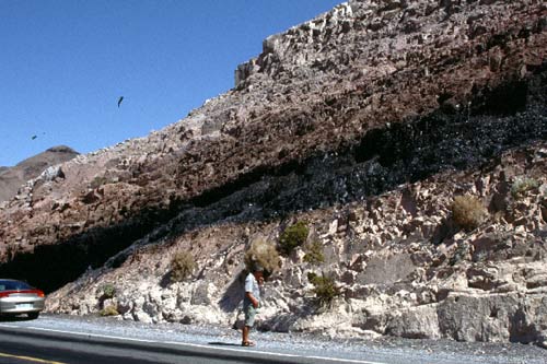 Plus loin, nous nous arrêtons à 1 ou 2 kms avant Shoshone pour voir cette couche noire mise à nue par les travaux routiers probablement. |