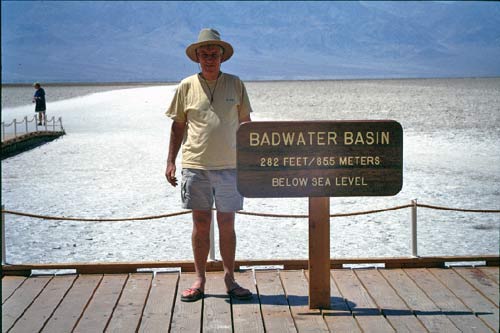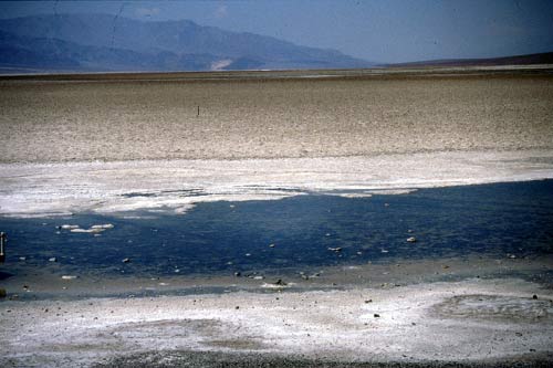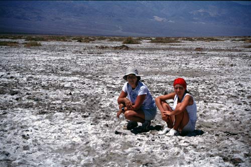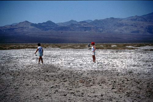 Nous nous arrêtons à Badwater, l'endroit le plus bas des USA à 86 m au dessous du niveau de la mer. Avant de se retirer la mer était bien là, il y a très très longtemps. Il y a maintenant un peu d'eau à Badwater, mais les étendues de sel sont immenses. La couleur blanche embrase le paysage et nous gardons nos chapeaux bien sur le tête.